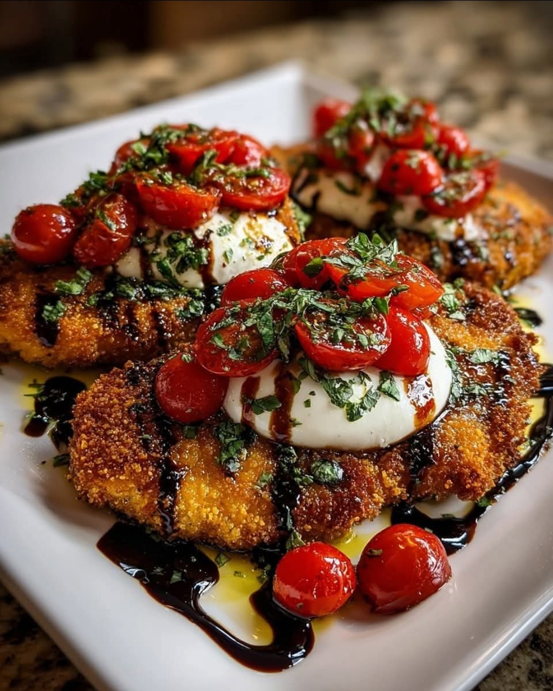 In the same skillet, add 1 tbsp olive oil and sauté cherry tomatoes for 3–4 minutes until softened. Reduce heat to low and stir in heavy cream and torn pieces of burrata until creamy. Add chopped basil and season with salt and pepper. Pour sauce over chicken and garnish with extra basil. Serve immediately.