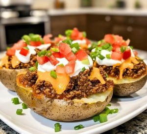 Slice open the baked potatoes and fluff the insides with a fork. Spoon seasoned beef over the top.