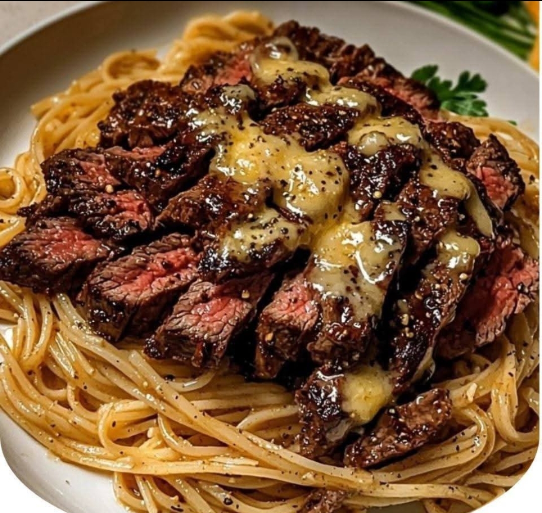1. Plate the noodles, top with steak slices, and drizzle some extra sauce over the top.