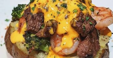 Easy Loaded Baked Potato with Steak, Shrimp, Broccoli, and Cheese Sauce