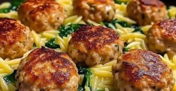 Lemony Chicken Ricotta Meatballs Over Garlic Spinach Orzo