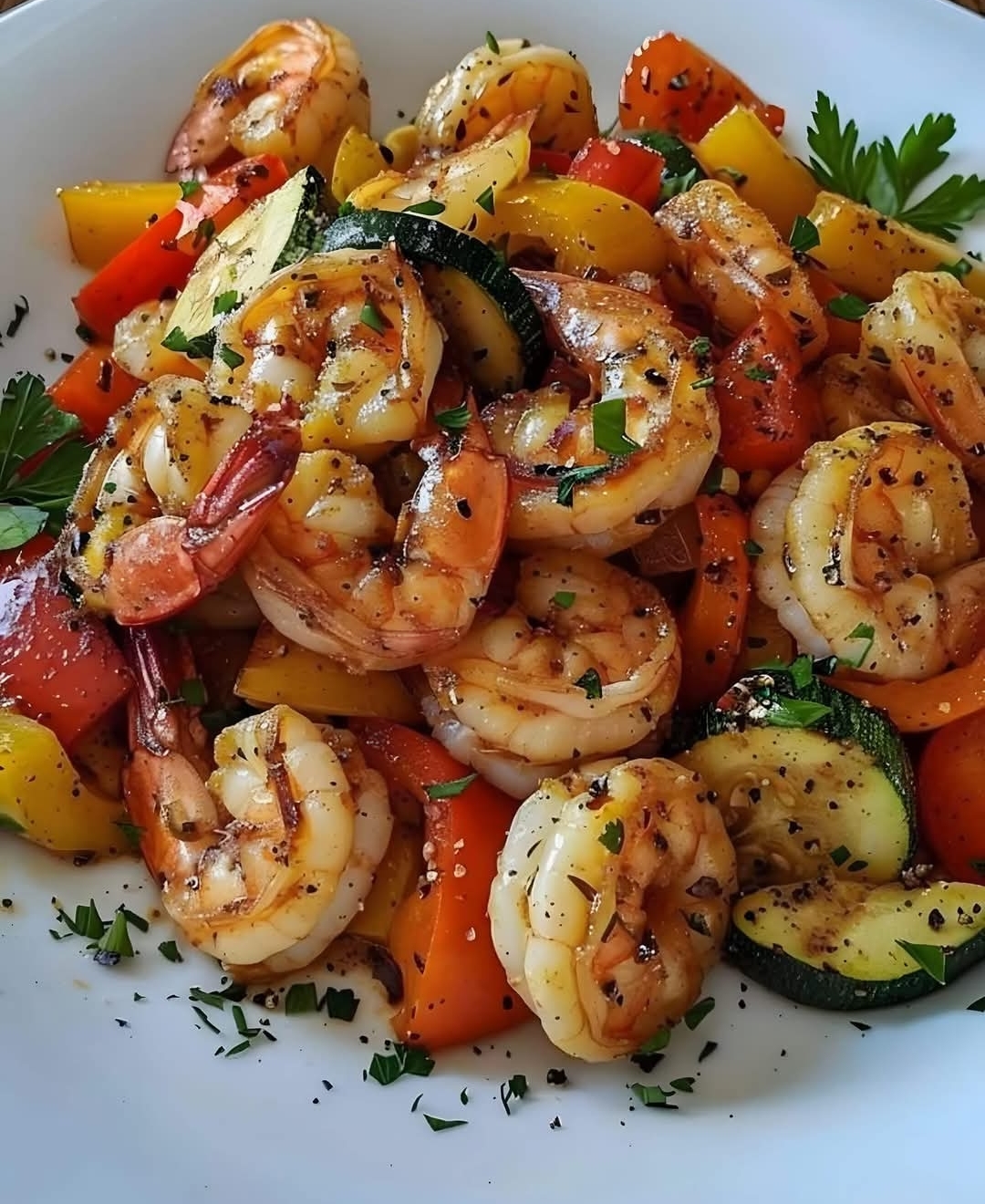 Serve the Lemon Herb Shrimp and Veggie Skillet hot, garnished with fresh herbs if desired.