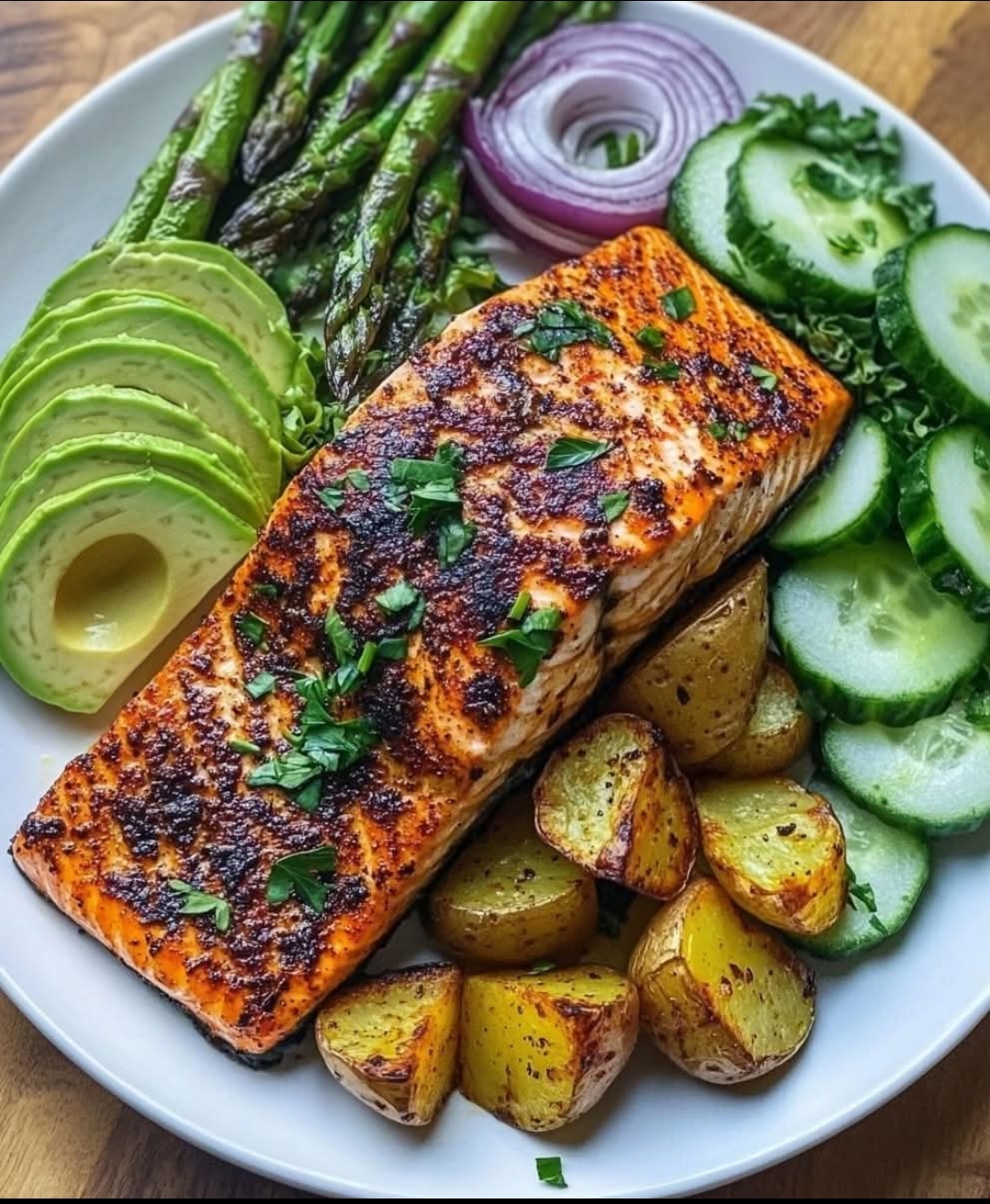 Plate salmon with roasted potatoes and asparagus. Add greens, cucumber, red onion, and avocado on the side. F