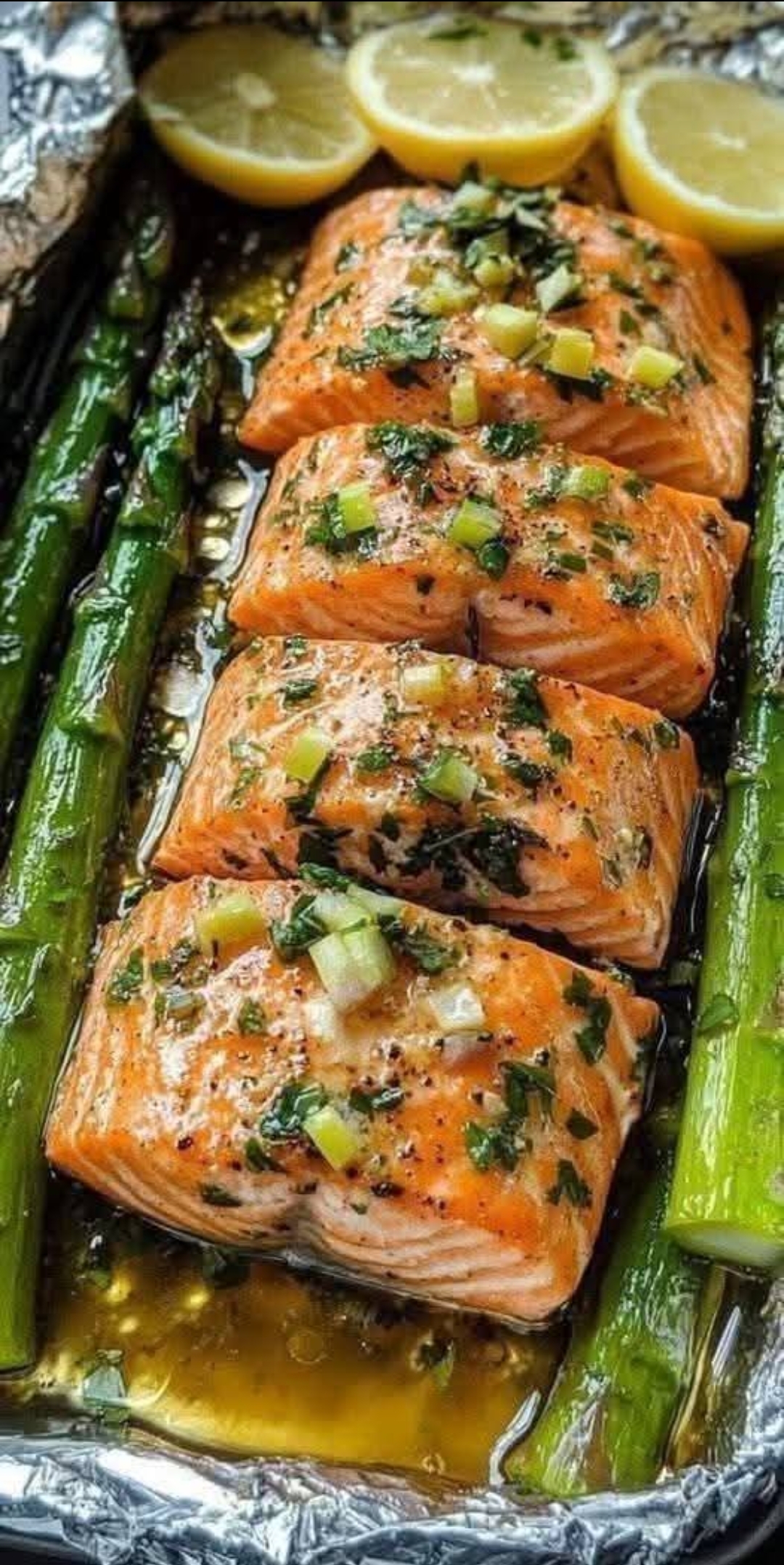 Drizzle this mixture over the salmon and asparagus, then season with salt and pepper.