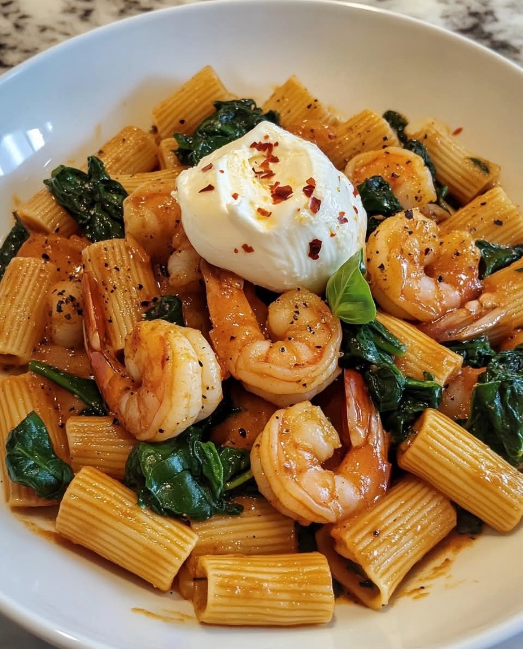 Garlic Butter Shrimp & Spinach Rigatoni with Creamy Burrata