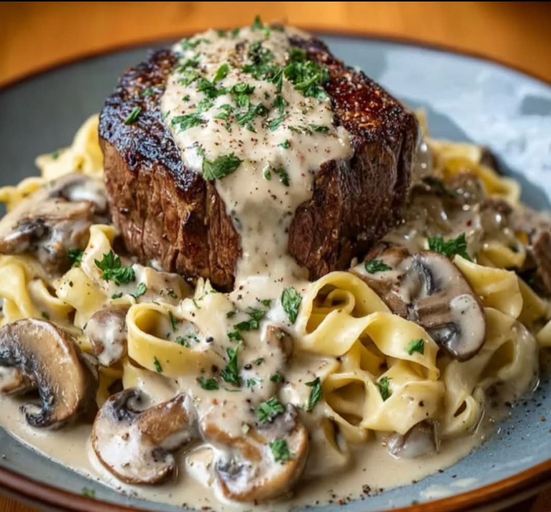Servir les médaillons nappés de sauce aux champignons, accompagnés des tagliatelles. Ajouter un peu de persil frais juste avant de servir, si désiré.